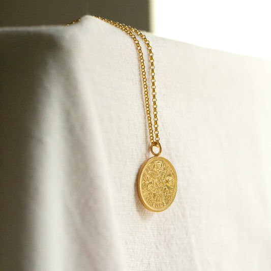 Sixpence Pendant Necklace - Gold Plated - QEII