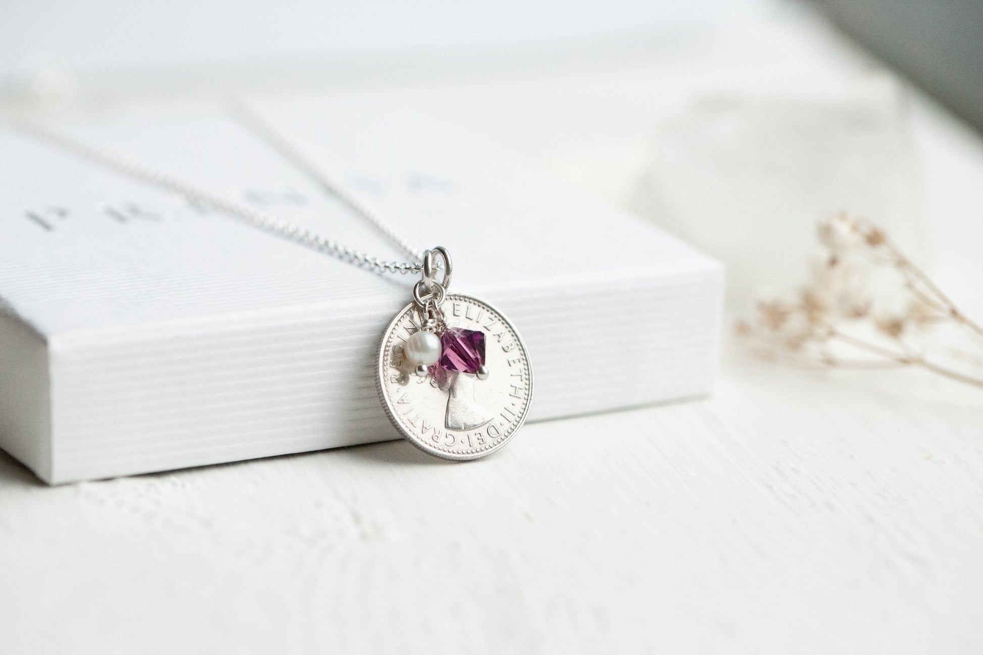 Let vintage treasure tell a story with our handcrafted 1966 British sixpence coin necklace and birthstone charm; a timeless piece of 60th jewellery steeped in tradition.